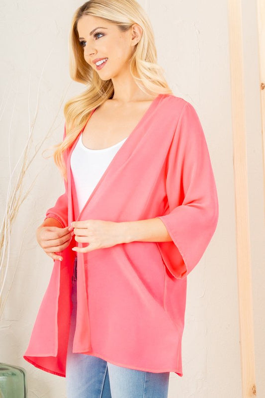 3/4 Sleeve Solid Cardigan NEON CORAL